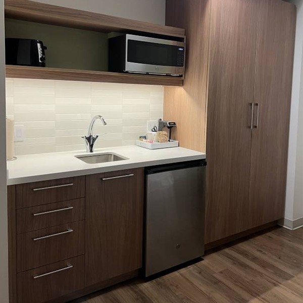 Linear Kitchenette Design Wood Cabinet Floating Shelf Quartz Countertop Pantry, Minifridge and Microwave Oven